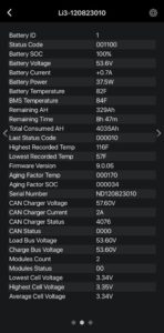 Here, you’ll see live data from your battery, including state of charge, voltage, current, power, and temperature. Color indicators make it easy to understand the health and status of your system at a glance.